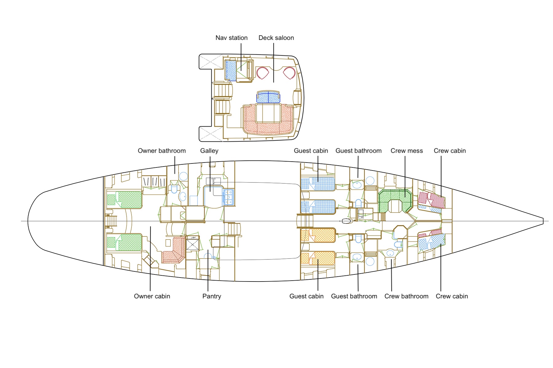 • Hybrid propulsion – 8h silent cruising, power regeneration under sail, lithium-ion energy systems
